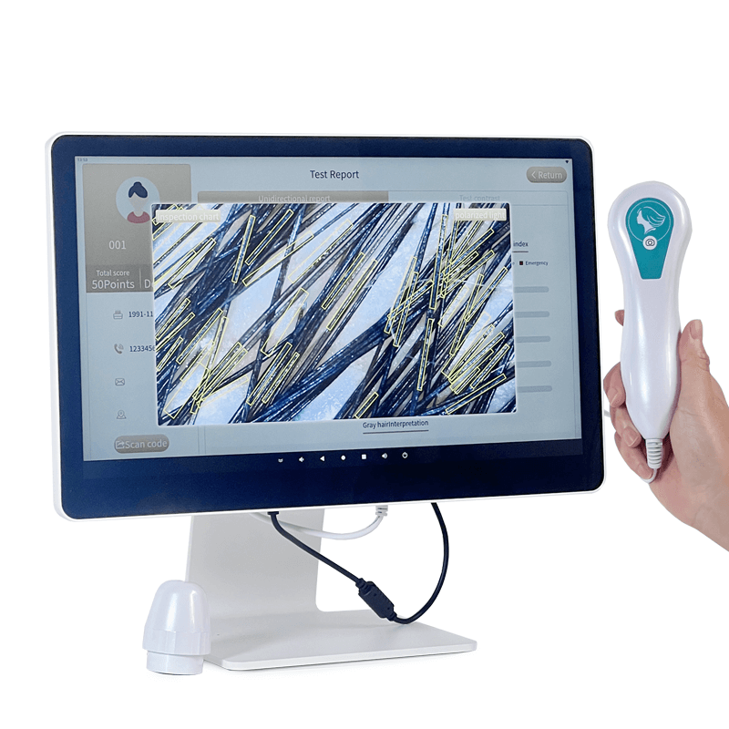 Hair analysis machine SA34 with 1.5 million pixel high resolution, offer 3 group of lamps to detect different hair scalp layer. And provide in total 9 report + one comprehensive report for whole hair scalp situation detecting. The database and running background could be under other computer or on same hair analyzer screen. The machine monitor with Android system and able to connect with WIFI. Even do not run scalp analyzer could work as single computer.