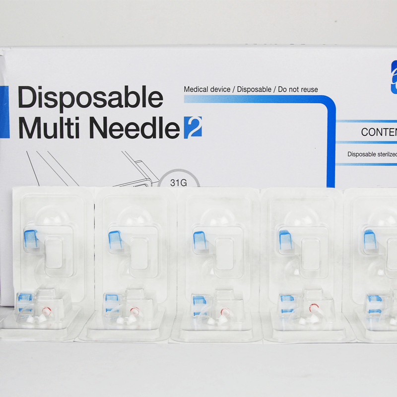 Vital injector 2 needle at the beginning default use 5pin needle. But since derma shine pro using 9pin needle, the vital injector also come with 9pin. Each needle packing by single sterilized pocket, and then 20pcs packing into one box. Regarding to the needle touch deeper skin and blood all have very strict sterilizing and package requirement.